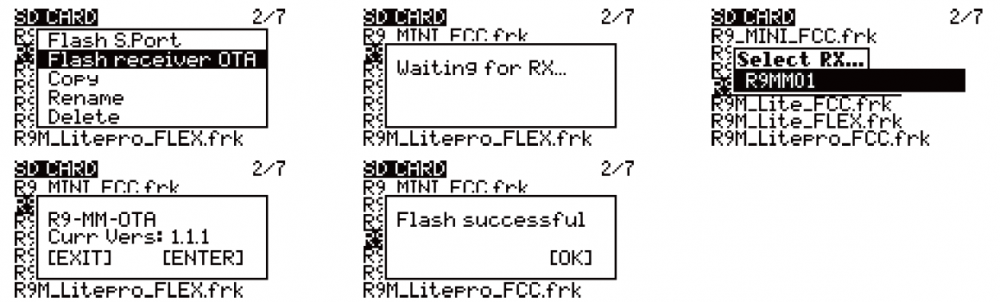 Např. u Taranis X-Lite Pro: jděte na SD kartu 2/7 a vyberte Firmware, stiskněte tlačítko Enter, vyberte (Flash RX by ext. OTA), zapněte přijímač, vyberte RX, jděte na (ENTER), po dokončení flashování bude na vysílači zobrazeno (Flashování dokončeno). Vypněte a zapněte přijímač a počkejte 3 sekundy, zelená LED začne blikat, oznamujíce, že přijímač pracuje správně.